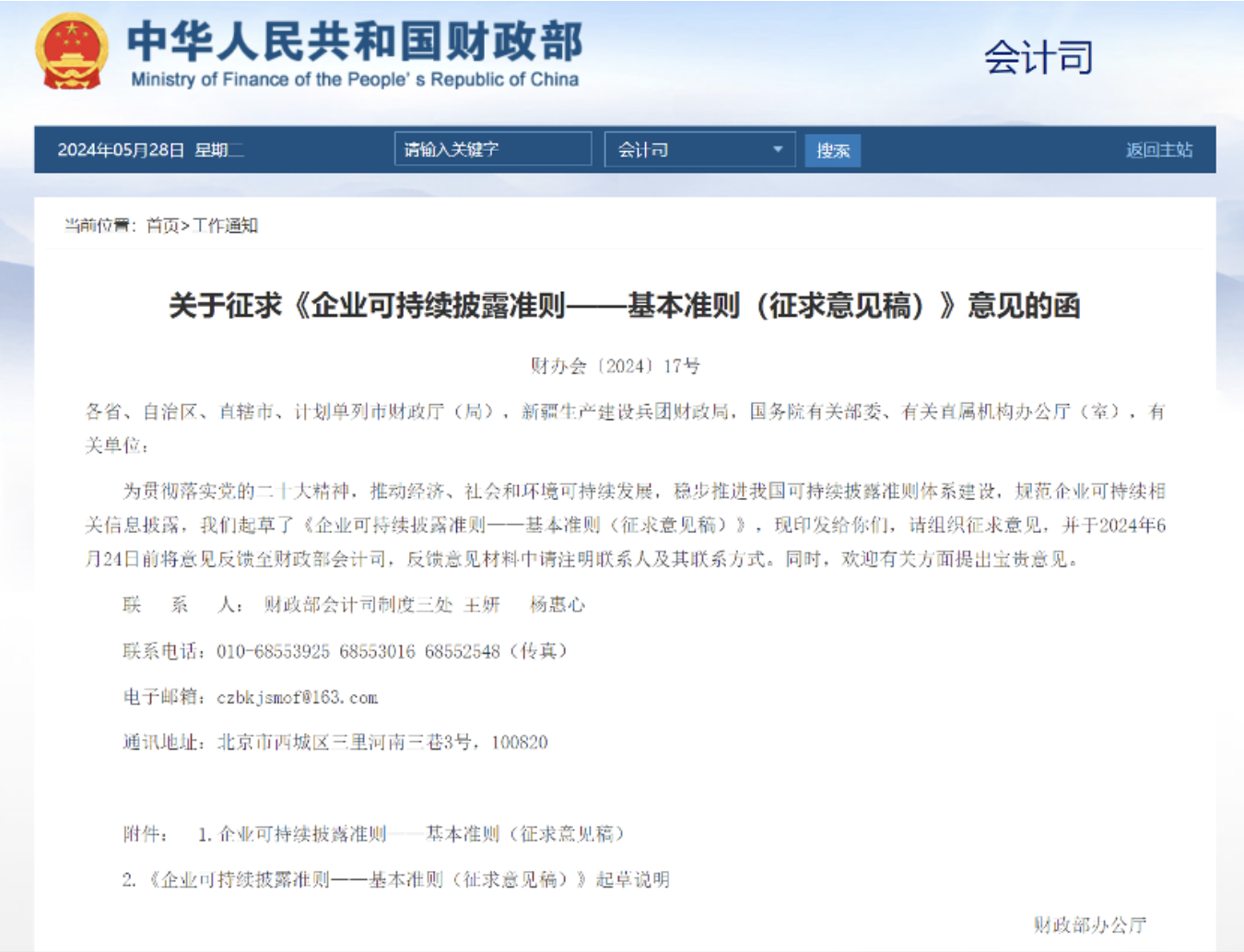 财政部5月27日发函,就《企业可持续披露准则——基本准则(征求意见稿)》征求意见。《意见稿》提出,到2027年,我国企业可持续披露基本准则、气候相关披露准则相继出台;到2030年,国家统一的可持续披露准则体系基本建成。